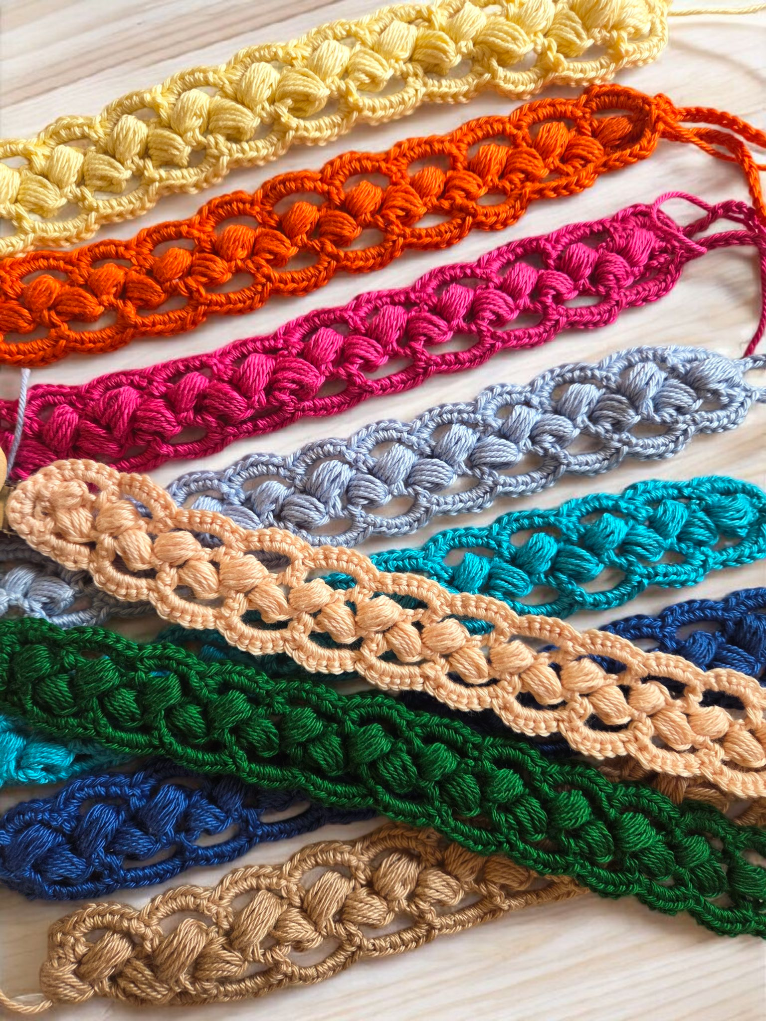 Jaune clair, Jaune, Orange, Rouge, Rose, Fushia, Violet clair, Violet, Bleu clair, Bleu, Bleu roi, Vert clair, Vert, Vert sapin, Beige, Écru